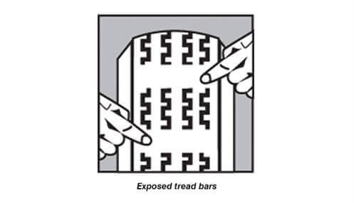 When the tread is worn down to one-sixteenth of an inch, the tire is worn out and it is time to replace it. Built-in tread wear indicators, or "wear bars," which look like narrow strips of smooth rubber across the tread, will appear on the tire when that point of wear is reached.